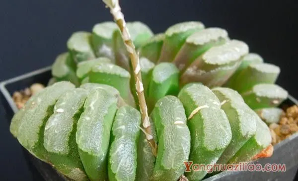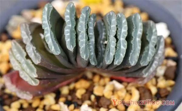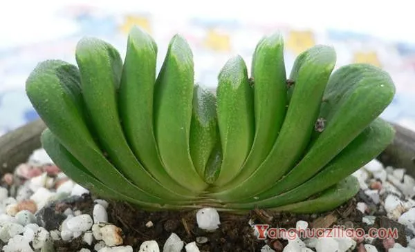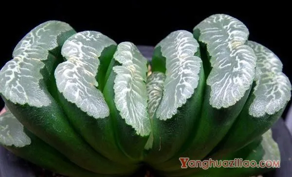 肉蒲团 yanghuaziliao.com玉扇又名截形十二卷,属于百合科十二卷属的多肉植物、也称多浆植物,植株无茎,肉质叶排成两列呈扇形,叶片竖立,稍向内弯,顶部略凹陷。表面粗糙,绿色至暗绿褐色,有小疣状突起,新叶的截面部分透明,呈灰白色。