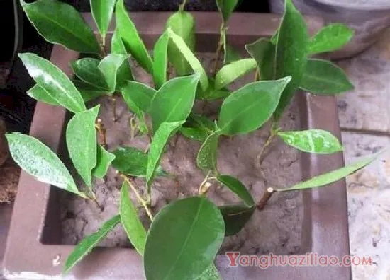 奇花异草 yanghuaziliao.com榕树可用枝条扦插繁殖,但比较难成活,适合在5-9月份进行,可取10公分左右枝条,每段含3~4小节,保留上端一片叶子,入土1/3,盖塑料膜并控温25℃,一月左右生根移植,注意栽种的基质要疏松、透气,不能使用粘重的土壤,栽种之前可将土壤浇湿。