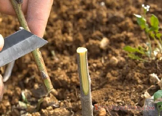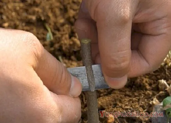 靠接:把砧木底部5厘米的地方剪断,在树皮的位置垂直下割4厘米深,穗上要有饱满的芽,然后在下面斜剪成2-3厘米的单斜面,将接穗的一段插进砧木的切口处,然后用塑料薄膜绑紧,包裹严实一点,但是芽一定露在外面。