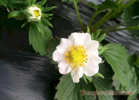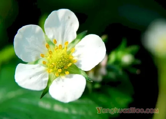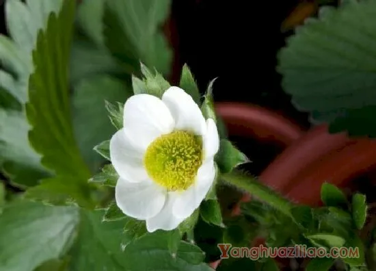 草莓花是比较小一点的,它的萼片和苞片是展开生长着的,花朵的颜色是白色的,有着淡淡的香味,很适合在院子里养护。