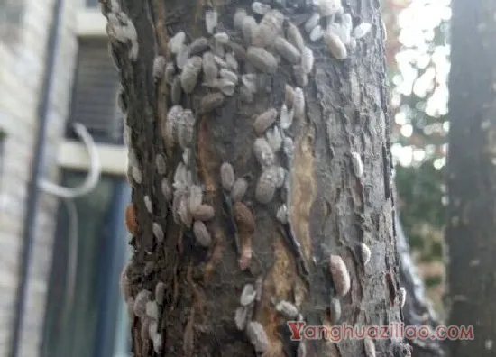 2、草履蚧:草履蚧群集在树枝上刺吸,在土壤中或者在卷曲的枯叶内产卵,繁殖力惊人,草履蚧数量较多的话,爬满枝干,排泄物顺枝条下流面。