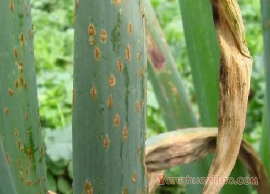 4、锈病:葱在发生锈病之后,对于叶片、花梗以及茎部的危害是最大的,在发病的时候会有橙黄色疱斑,道理后期的时候表皮会逐渐破裂,并且向外翻,出橙黄色粉末。