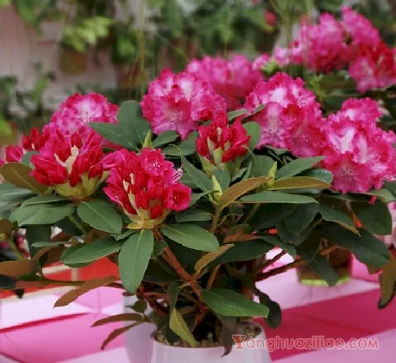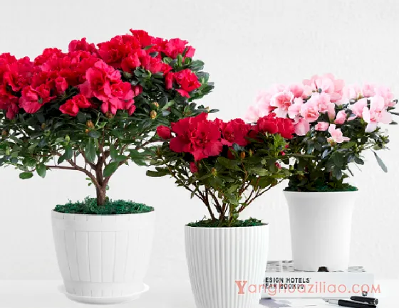 桃园 yanghuaziliao.com一般来说常见的杜鹃花花色是红色、白色、黄色、紫色、绿色和粉色,带有各自不同的魅力与风情。杜鹃花有很多分枝,叶片为深绿色的卵形、倒卵形或者是椭圆状的卵形,且边缘还有小细齿。花朵是2-3朵簇生在枝顶的,有鲜红色、玫瑰红色。蒴果很小,为倒卵形。