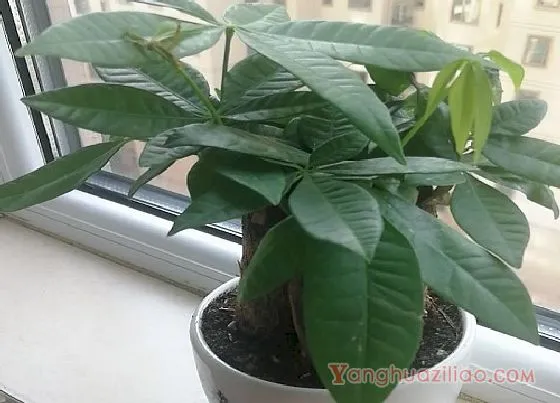 发财树适合在高温高湿的气候中生长,耐寒能力较差,适合生长在肥沃疏松、透气保水的土壤中,开花的时候,花朵单生于叶腋处,花朵的颜色为白色,形状为杯状。
