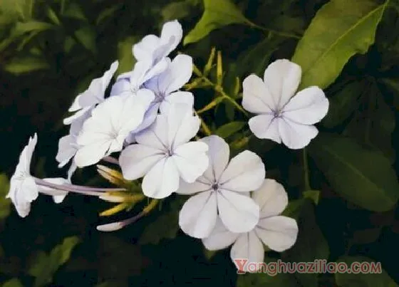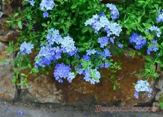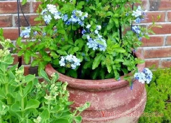 桃园 yanghuaziliao.com蓝雪花又叫做山灰柴、假靛等,是白花丹科、蓝雪花属的草本植物,植物直立生长,高度在20-60厘米不等,地下茎分枝多,节上有红色鳞片。蓝雪花的叶色翠绿,花色淡雅,观赏价值很高,可以用来点缀居室、美化环境,或者是作为道路、场馆的园林植物。