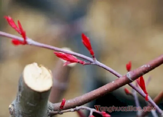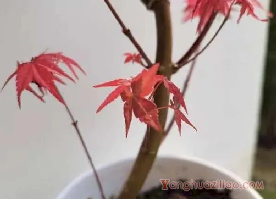 荣荣 yanghuaziliao.com红枫最好在8月进行摘心,摘除叶子的时候注意叶子以及叶柄都可以摘除的,如果时间允许,建议要摘除叶柄。红枫在进行摘叶摘心前,要追一次肥促进抽生新叶。观察它的整体,剪去外侧的凌乱枝条,适当疏剪即可,主侧枝短截,多余的侧枝全部剪掉。